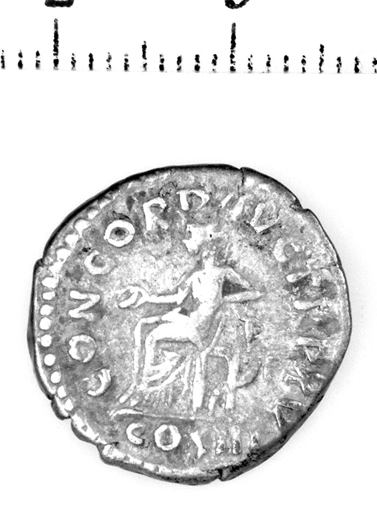 D/ Testa nuda di M. Aurelio volto a d.. R/ La Concordia assisa a s. con patera nella d., appoggia il braccio s. su statuetta della Spes posta su cornucopia