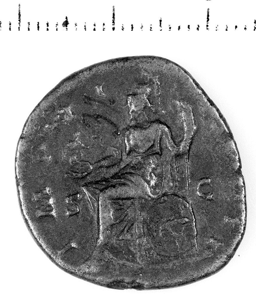 D/ Testa radiata di M. Aurelio, volta a d. R/ Roma assisa a s. su una corazza, impugna lo scettro e poggia il gomito s. su uno scudo rotondo sovrapposto ad altri 2 scudi