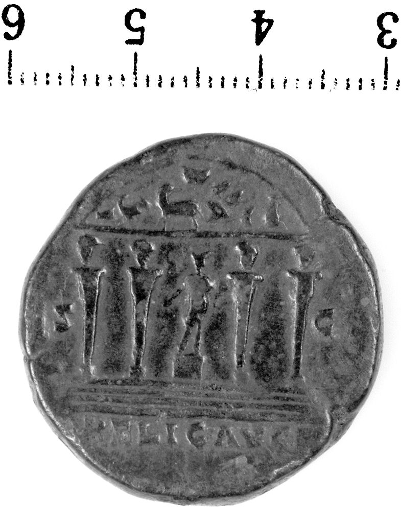D/ Testa di M. Aurelio laureata a d.. R/ Tempio tetrastilo con frontone semicircolare su podio con 4 gradini; erme al posto delle colonne; nel frontone 2 quadrupedi retrospicienti ed oggetti incerti. Al centro dell'edificio statua di Mercurio con petasus e caduceo