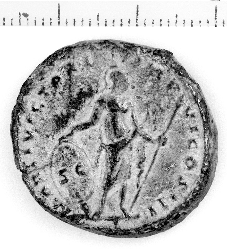 D/ Busto di M. Aurelio drappeggiato e laureato a d.. R/ Marte stante di fronte e volto a d., con lancia nella mano s., ostenta uno scudo ovale iscritto