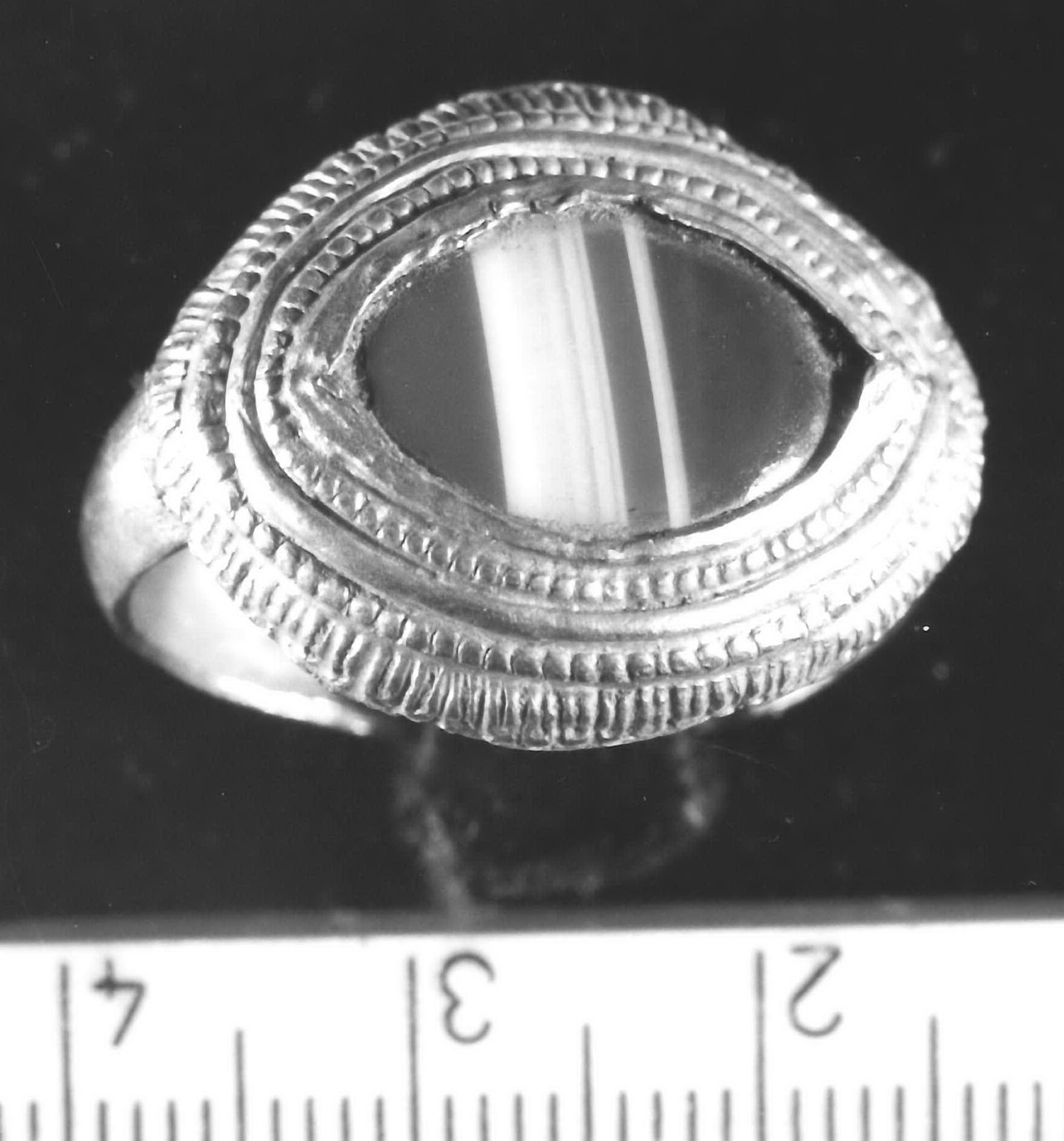 Verga scanalata internamente e castone a occhio composto di due lamine saldate fra loro: sulla inferiore piatta poggia il castone in onice incorniciato dalla laminetta decorata a sbalzo con baccellature, fili in rilievo lisci e un filo in rilievo imitante filo godronato