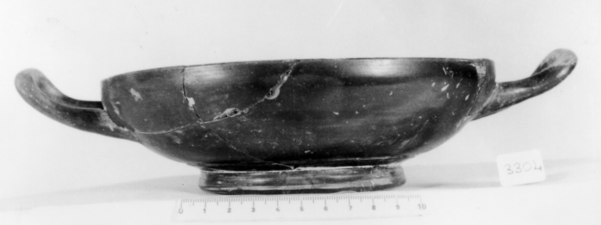 Labbro diritto ad orlo assottigliato; vasca emisferica, ampia e profonda; lunghe anse a bastoncello, insellate, impostate obliquamente sulla parte mediana della parete e leggermente sormontanti la bocca; basso piede ad anello sagomato. Fondo interno delimitato da un risalto accentuato e decorato a stampiglie: giro di sei palmette su stelo con foglie