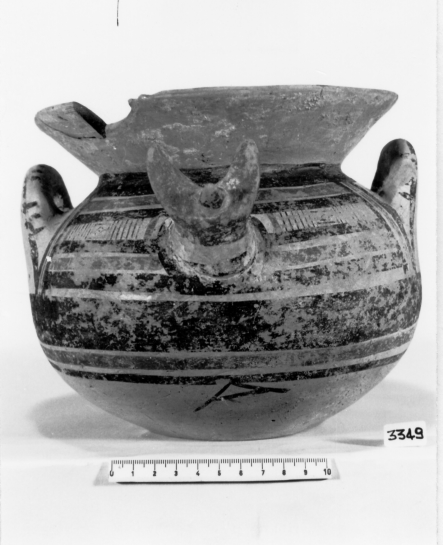 Larga bocca imbutiforme ad orlo arrotondato; corpo globulare schiacciato; anse a nastro ingrossato, a maniglia, impostate verticalmente sulla spalla; tra di esse, protome schematica di animale dal muso conico e dalle corna lunate; fondo piatto. Decorazione in vernice bruna e rossiccia su fondo risparmiato: su tutto il corpo, fasce orizzontali di diversa larghezza; sulla spalla, motivo a tratti verticali interrotto da rettangoli con losanghe all' interno; reticolo intorno all' attacco delle anse e segmenti verticali su di esse; sul labbro, motivo costituito da quattro fasce semicircolari, tangenti ad una banda che delimita l' imboccatura e da filettature ad esse concentriche