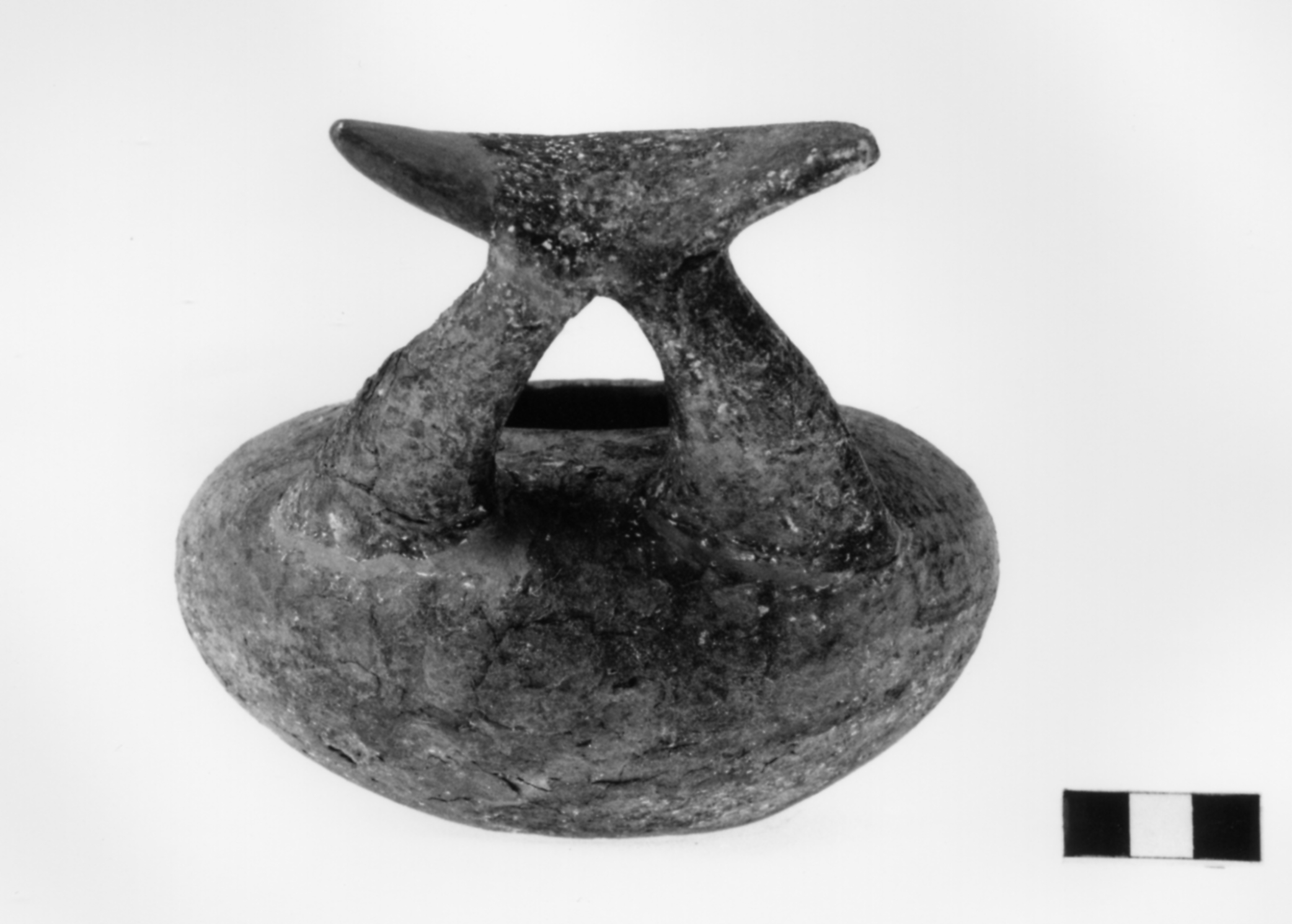 Corpo globulare schiacciato a labbro rientrante, fondo piatto. Ansa nastriforme triangolare con terminazione semilunata