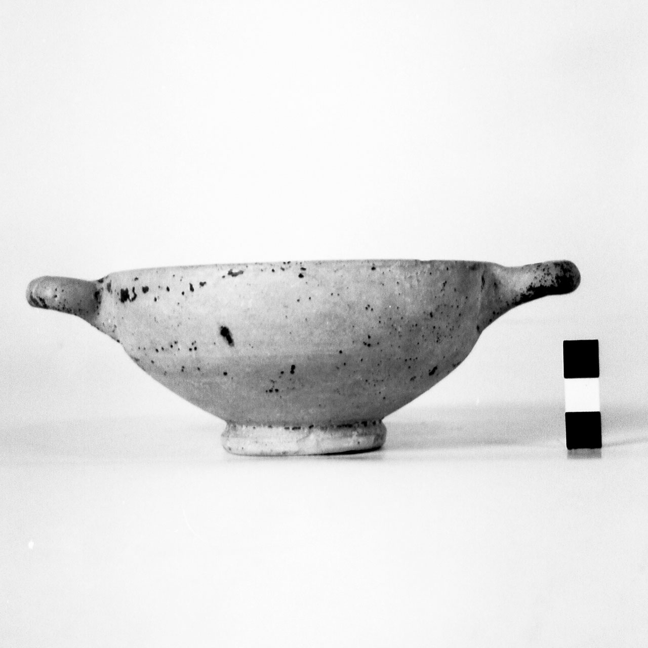 Labbro indistinto, con orlo arrotondato e appena ispessito all` interno; vasca emisferica; anse orizzontali a bastoncello impostate sotto l' orlo; basso piede ad anello con sottile modanatura sul bordo. Ingobbio giallino