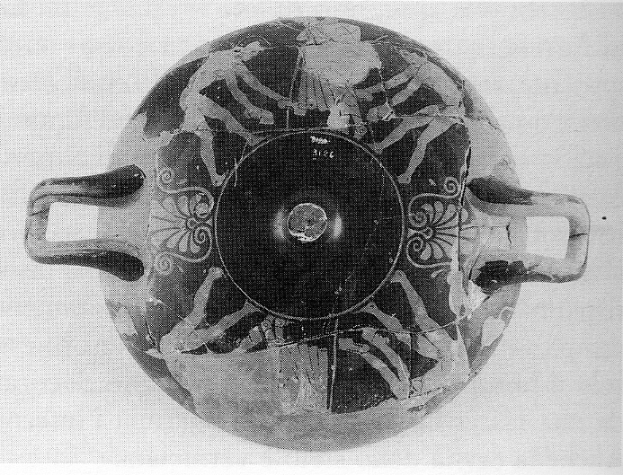 Interno: Giovane ammantato, volto in profilo verso destra, appoggiato al bastone. Esterno, lati A-B: paidotribes affiancati da atleti con halteres