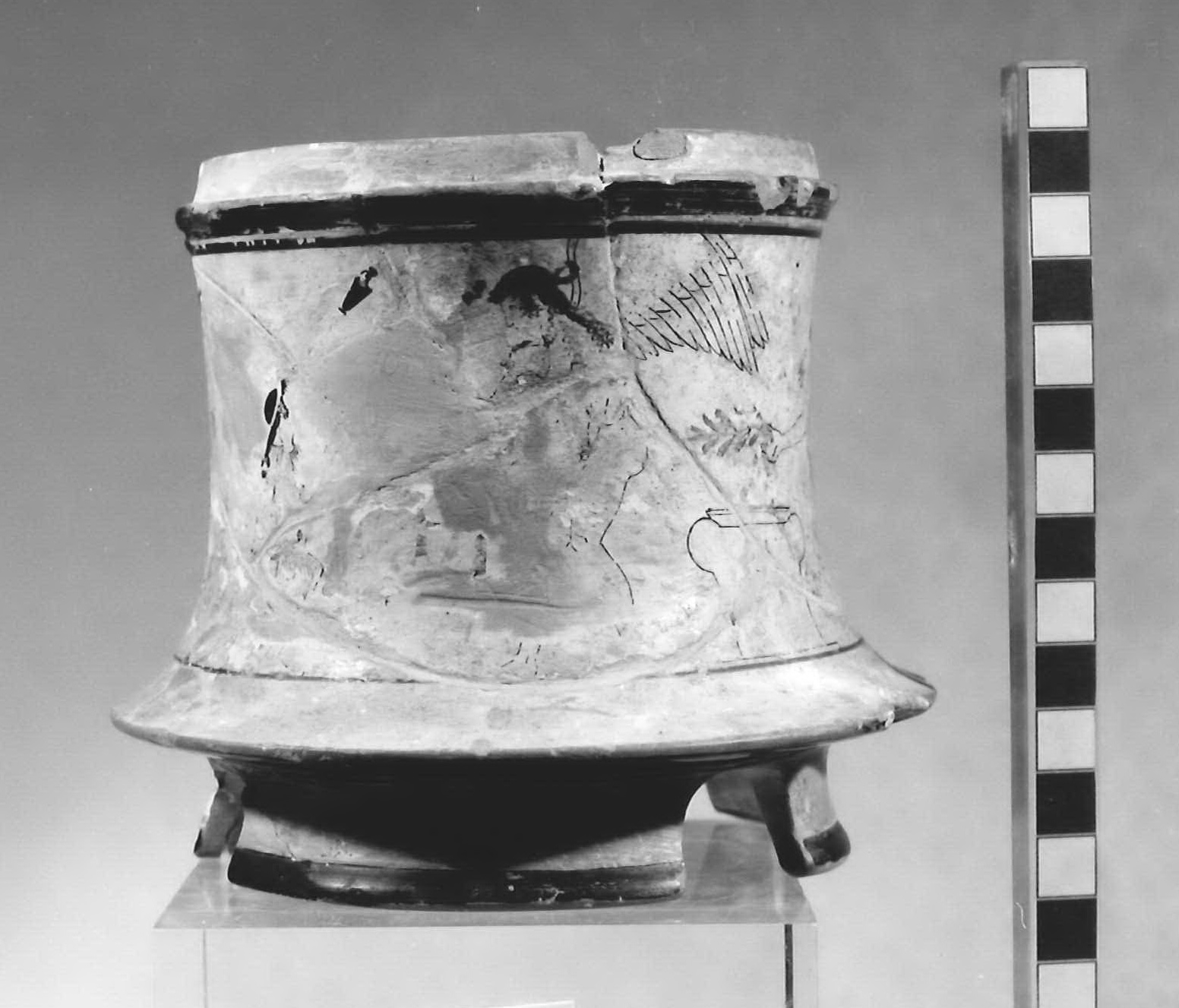 Pisside con breve orlo rilevato e gradino per il coperchio; corpo cilindrico dal profilo concavo, base a tre segmenti. Fregio continuo con la nascita di Afrodite alla presenza di Peith? ed assistente, Eros e di Zeus ed Hera presso un altare.I nomi delle divinità sono iscritti accanto a ciascuno, a vernice nera
