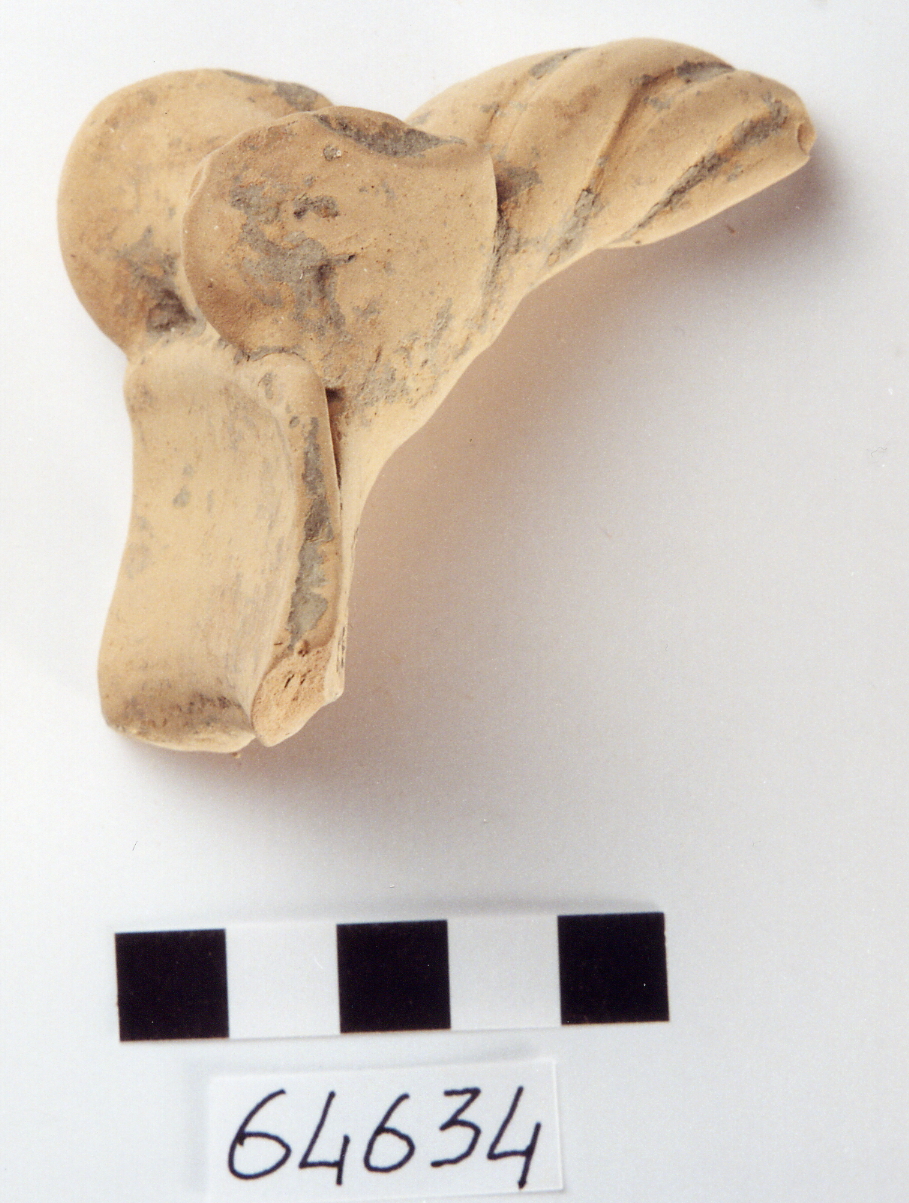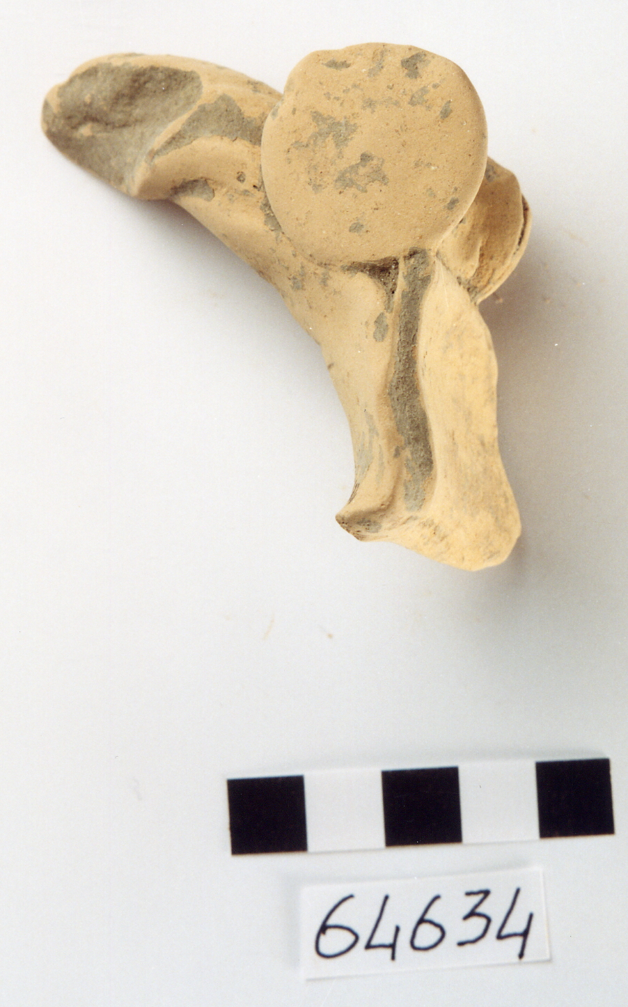 Ansa ancora attaccata ad una parte di collo del vaso. Il collo era svasato o diritto comunque bombato. L'attaccatura dell'ansa è decorata da una coppia di rotelle, una di esse è intera, l'altra è mutila