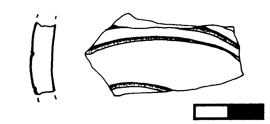 Parete a profilo leggermente convesso. Impasto di colore nerastro, superficie lisciata. Decorazione: linee incise curve concentriche