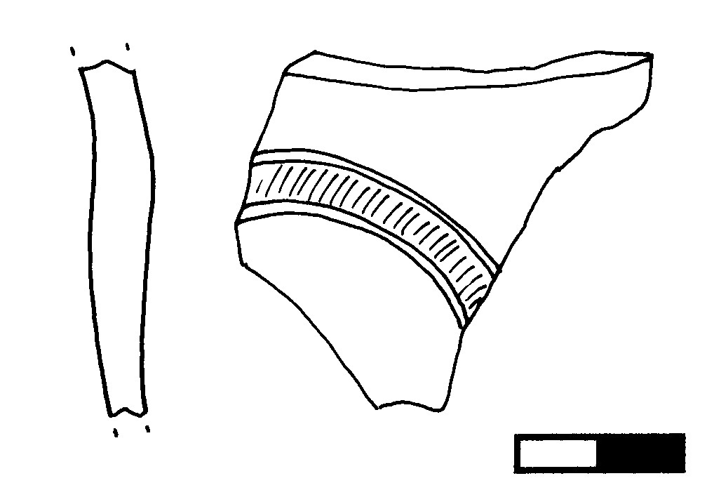 Parete a profilo sinuoso concavo-convesso. Impasto di colore nerastro, superficie lisciata. Decorazione: fascia curvilinea marginata da due linee parallele campita con tratti incisi paralleli