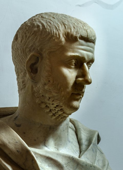 - NOTIZIE STORICO CRITICHE I dati tecnici riguardano la sola testa. Nell'indicazione materica del pezzo, il marmo si riferisce alla testa, mentre l'alabastro al busto moderno, di cui è necessaria la realizzazione di una scheda OA. Nella pubblicazione relativa (cfr. bibliografia), è difficile l'identificazione del ritratto per la genericità della descrizione; dovrebbe trattarsi di uno tra i numeri 1928 e 1931. A sostegno della datazione, oltre alle rughe e alla resa delle guance, sono anche l'attaccatura dei capelli e la lavorazione delle masse pelose. Nel ritratto, però, non risaltano le caratteristiche della corrente orientale della scultura del periodo