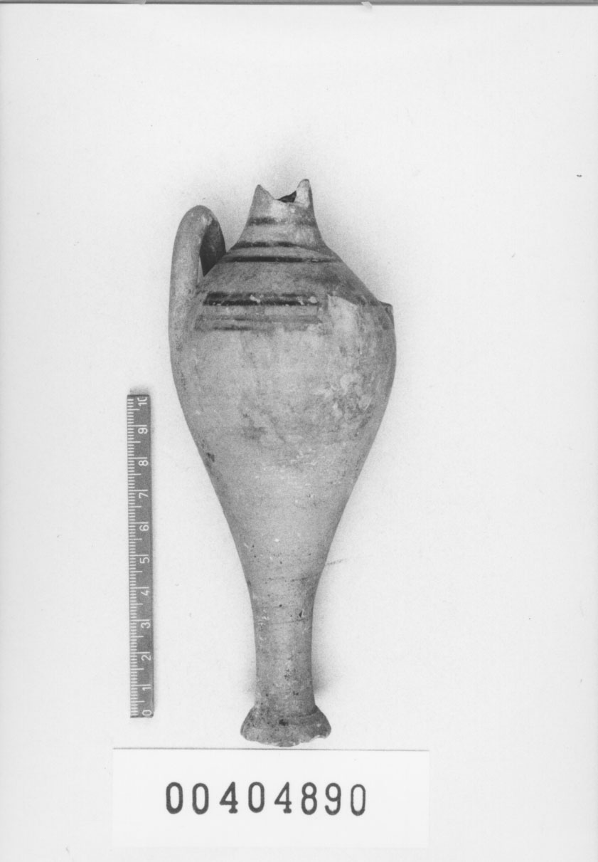 corpo fusiforme allungato nella parte inferiore, orlo leggermente svasato, labbro a sezione triangolare, stretto collo cilindrico allungato, piede troncoconico indistinto. Anse orizzontali a bastoncello impostate sulla spalla. Decorazione esterna: serie di fasce parallele in vernice nera diluita al di sopra della spalla. Decorazione interna: superficie del collo e dell'orlo ricoperta di vernice nera. Sul corpo del vaso appaiono visibili segni del tornio
