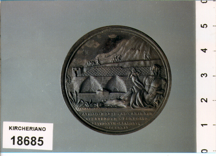 D/ GREGORIVS.XVI.PONT.MAX.AN.IV.,BUSTO A S.;SOTTO CERBARA.IOSEPH.F.;R/ FIGURA DELL'ANIENE GIACENTE SOTTO IL MONTE CATILLO;SULLA LINEA DI ESERGO,CERBARA.IOSEPH.F.;IN ESERGO,CATILLO. MONTE.AD.ANIENEM/AVERTENDVM.PERFOSSO/ELVVIONVM.CLADIBVS/OCCVRRIT