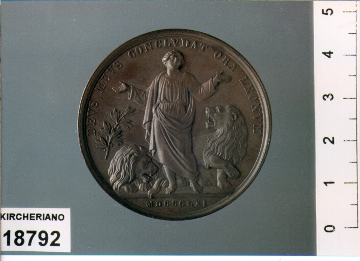 D/ PIVS IX PONT . MAX . AN . XVI, BUSTO A S. ; SOTTO C . VOIGT; R/ DEVS MEVS CONCLVDAT ORA LEONVM, IL PROFETA DANIELE FRA DUE LEONI; IN ESERGO MDCCCLXI