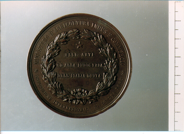 D/ VITTORIO EMANUELE II RE D'ITALIA, TESTA A S.; SOTTO G.FERRARIS.; R/ MINISTERO D'AGRICOLTURA INDUS. E COMMERCIO; ESPOSIZIONE INTERNAZIONALE DI LONDRA 1862; ENTRO CORONA DI ALLORO, ALLE ARTI / ED ALLA INDUSTRIA / DELL'ITALIA UNITA