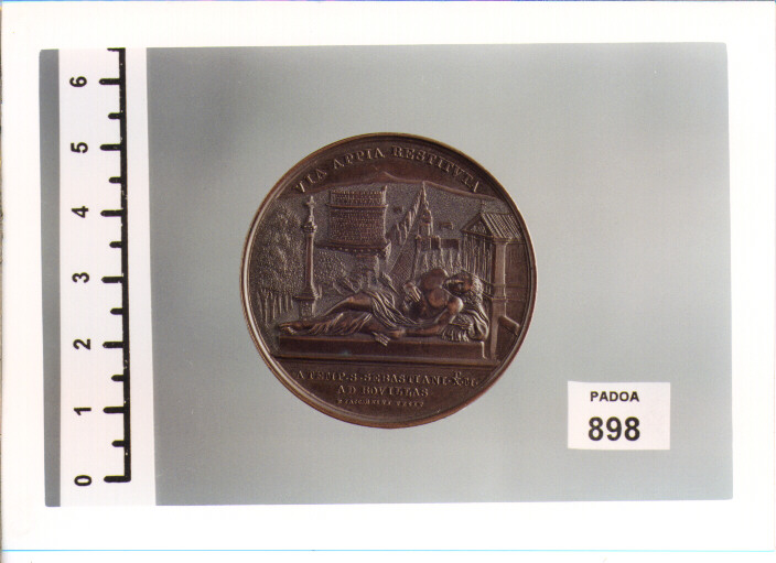 D/ PIVS.IX.PONTIFEX.MAXIMVS.ANNO VII.,BUSTO A D.; SOTTO BONFIL.ZACCAGNINIINC.; R/ VIA APPIA RESTITVTA,VEDUTA DELLA VIA APPIA ANTICA; IN ESERGO, A TEMP.S.SEBASTIANI.XP.M./AD BOVILLAS; SOTTO B.ZACCAGNINI FECIT