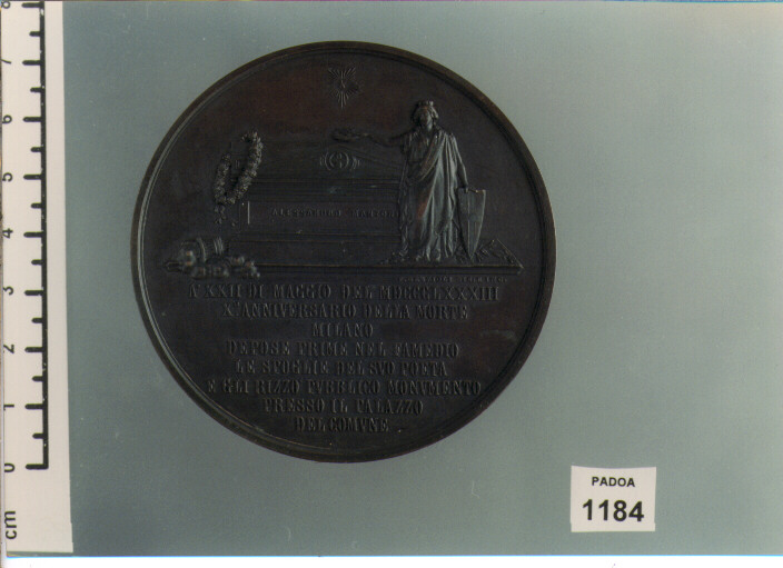 D/ ALESSANDRO MANZONI, BUSTO DI PROSPETTO A S., ENTRO CORONA D'ALLORO E QUERCIA; R/ L'ITALIA TURRITA DEPONE UNA CORONA SULLA TOMBA; A XXII DI MAGGIO DEL MDCCCLXXXIII/X ANNIVERSARIO DELLA MORTE/MILANO/DEPOSE PRIME NEL FAMEDIO/LE SPOGLIE DEL SVO POETA/