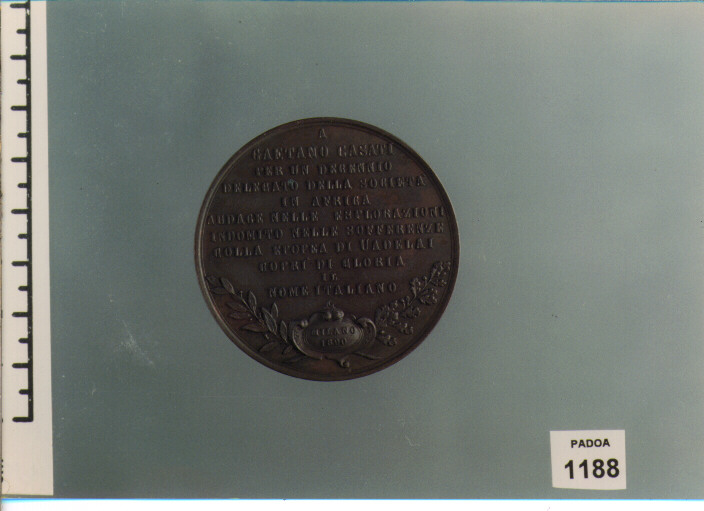 D/ SOCIETA' D'ESPLORAZIONE COMMERCIALE IN AFRICA MILANO, L'ITALIA TURRITASTANTE; SOTTO GRAZIOLI; R/ A/ GAETANO CASATI/PER UN DECENNIO/ DELEGATO DELLA SOCIETA'/IN AFRICA/AUDACE NELLE ESPLORAZIONI/.../SOTTO; TRA RAMI DI QUERCIA E ALLORO MILANO/1890