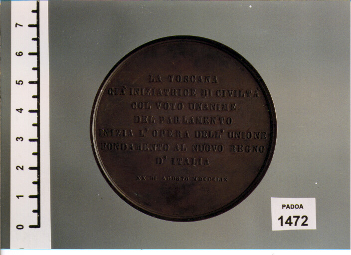 D/ E GRIDO' TUTTO IL POPOLO E DISSE: VIVA IL RE, IL RE SEDUTO TRA IL PIEMONTE E LA TOSCANA; IN ESERGO, T. P. ; SOTTO, A. PIERONI F. S. ONESTINI DIR. ; R/ LA TOSCANA/ GIA' INIZIATRICE DI CIVILTA'/ COL VOTO UNANIME/ DEL PARLAMENTO/ ..