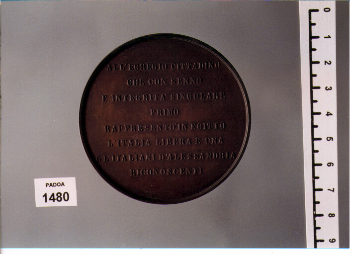 D/ COMMENDATORE GIOVANNI DOMENICO BRUNO, TESTA A S. ; SOTTO, A. PIERONI F. NEL 1865; R/ ALL'EGREGIO CITTADINO/ CHE CON SENNO E INTEGRITA' SINGOLARE/ PRIMO/ RAPPRESENTO' IN EGITTO/ L'ITALIA LIBERA E UNA/ GLI ITALIANI D'ALESSANDRIA/ RICOSCENTI