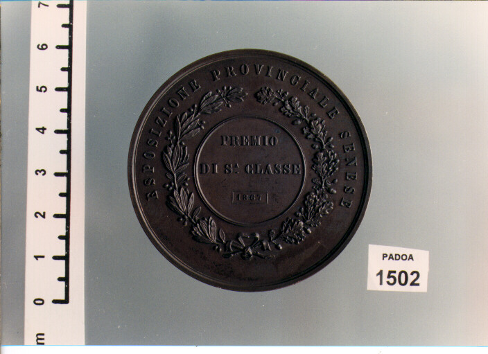 D/ FIGURA FEMMINILE TURRITA STANTE REGGE DUE CORONE; IN ESERGO, A. PIERONI F. IN LUCCA; R/ ESPOSIZIONE PROVINCIALE SENESE; ENTRO CORONA DI QUERCIA E ALLORO, PREMIO/ DI S.A CLASSE/ 1867