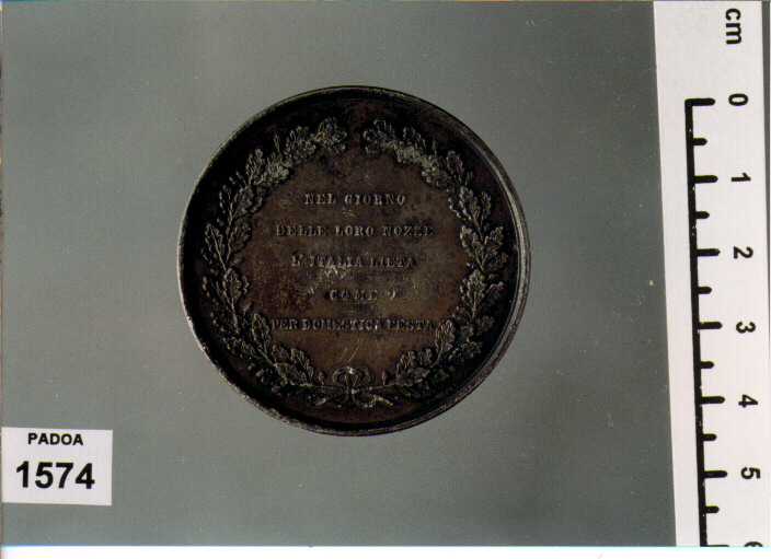 D/ AI PRINCIPI UMBERO E MARGHERITA DI SAVOJA, TESTA ACCOLLATE A S. ; SOTTO, L. GORI INC. ; R/ NEL GIORNO/ DELLE LORO NOZZE/ L'ITALIA LIETA/ COME/ PER DOMESTICA FESTA, ENTRO CORONA DI QUERCIA