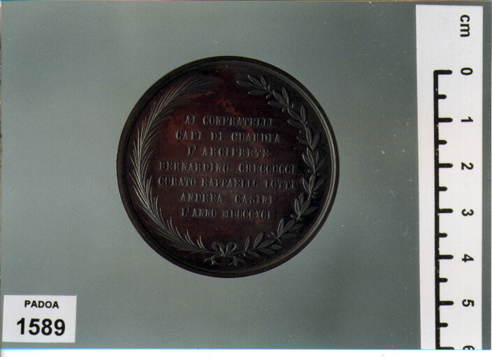 D/ S. SEBASTIANO MARTIRE, S. SEBASTIANO TRAFITTO R/ AI CONFRATELLI/ CAPI DI GUARDIA/ L'ARCIPRETE/ BERNARDINO CHECCUCCI/ CURATO RAFFAELLO LOTTI/ ANDREA CASINI/ L'ANNO MDCCCXCI, ENTRO CORONA DI PALMA E ALLORO