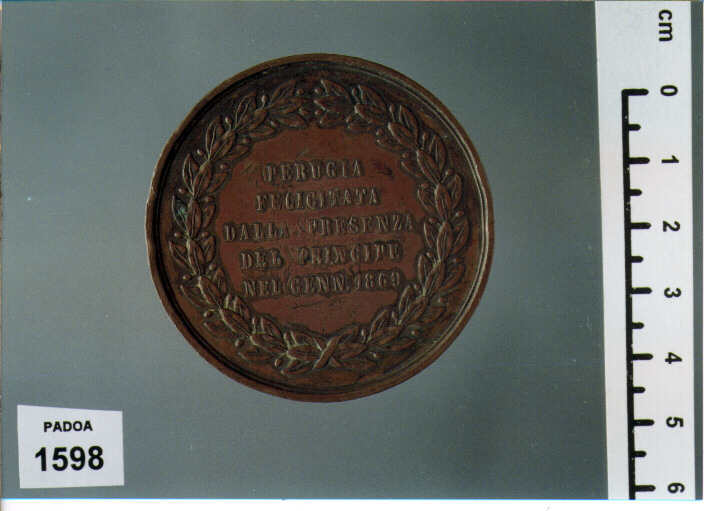 D/ VITTORIO EMANUELE II RE D'ITALIA, TESTA A S. ; SOTTO, L. GORI INC. ; R/ PERUGIA/ FELICITATA/ DALLA PRESENZA/ DEL PRINCIPE/ NEL GENN. 1869, ENTROCORONA DI ALLORO