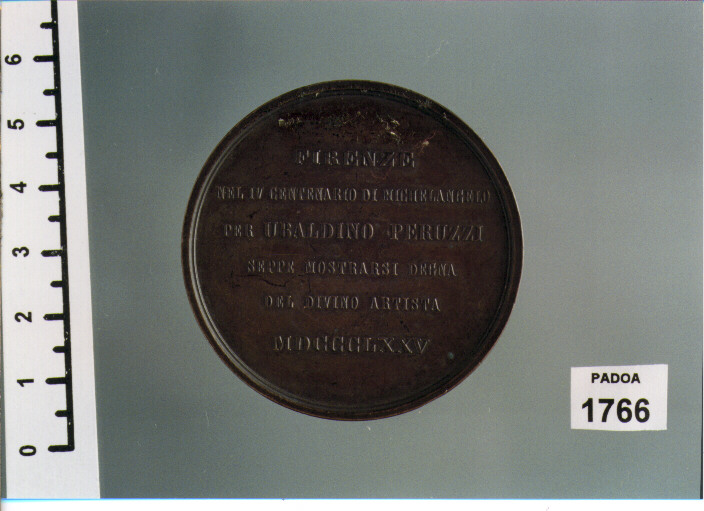 D/ BUSTO A D. ; SOTTO, PROF GB: TASSARA MOD. GIOV. VAGNETTI INC. IN FIRENZE; R/ FIRENZE/ NEL IV CENTENARIO DI MICHELANGELO/ PER UBALDINO PERUZZI/ SEPPE MOSTRARSI DEGNA/ DEL DIVINO ARTISTA/ MDCCCLXXV
