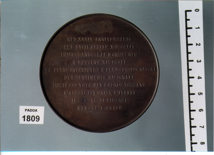 D/ BUSTO DI PROSPETTO; SOTTO, ITALO VAGNETTI FECE; R/ NEL XXXIX ANNIVERSARIO/ DEL XXVII APRILE MDCCCLIX/ INAUGURANDOSI IL MONUMENTO/ A BETTINO RICASOLI/ CHE DEGNO INTERPRETE E FERMO PROPUGNATORE/ DEL SENTIMENTO NAZIONALE/..
