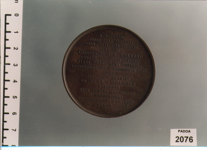 D/ CAV. ING. G. B. SALVINI DIRETTORE DELLA FERROVIA ROMA- SULMONA, BUSTO DI TRE QUARTI A D. ; SOTTO, GIOVANNI GIANI ROMA; R/ A RICORDO/ DELLE CIFRESAPIENTI/ DELLA PERTINACIA AMOROSA/ CON CUI/ L' INGEGNERE G. B. SALVINI/ DURATE NOVENNALI FATICHE/..