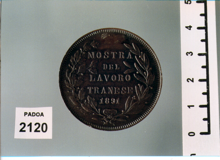 D/ STEMMA DI TRANI; SOTTO, F. AMOROSO; R/ MOSTRA/ DEL/ LAVORO/ TRANESE/ 1891, ENTRO CORONA DI QUERCIA E ALLORO