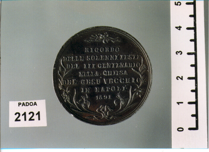 D/ PRODIGIOSA IMAGINE DI S. LUIGI GONZAGA, FIGURA DEL SANTO INGINOCCHIATAA S. ; IN ESERGO, F. AMOROSO; R/ RICORDO/ DELLE SOLENNI FESTE/ DEL III CENTENARIO/ NELLA CHIESA/ DEL GESU' VECCHIO/ IN NAPOLI/ 1891, ENTRO CORONA DI FIORI