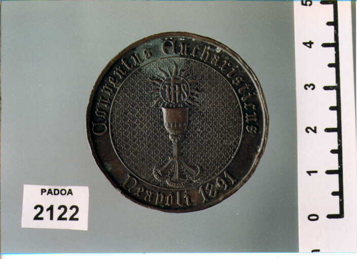 D/ IN FINEM DILEXIT EOS, MEZZA FIGURA DEL CRISTO DI PROSPETTO; SOTTO, V. PETRUZZELLI INC. ; R/ CONVENTUS EUCHARISTICUS NEAPOLI 1891, LA PISSIDE CONSOPRA L' EUCARESTIA