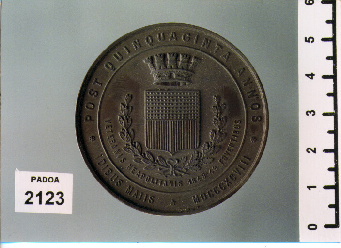 D/ POST QUINQUAGINTA ANNOS IDIBUS MAIIS MDCCCXCVIII, STEMMA CORONATO ENTRO CORONA DI QUERCIA E ALLORO; SOTTO, VETERANIS NEAPOLITANIS 1848- 49 FOVENTIBUS; R/ SANGUIS ET VIRTUS/ CIVIUM/ SEMEN LIBERTATIS, SOTTO, IDIBUS MAIISMDCCCXLVIII, ..