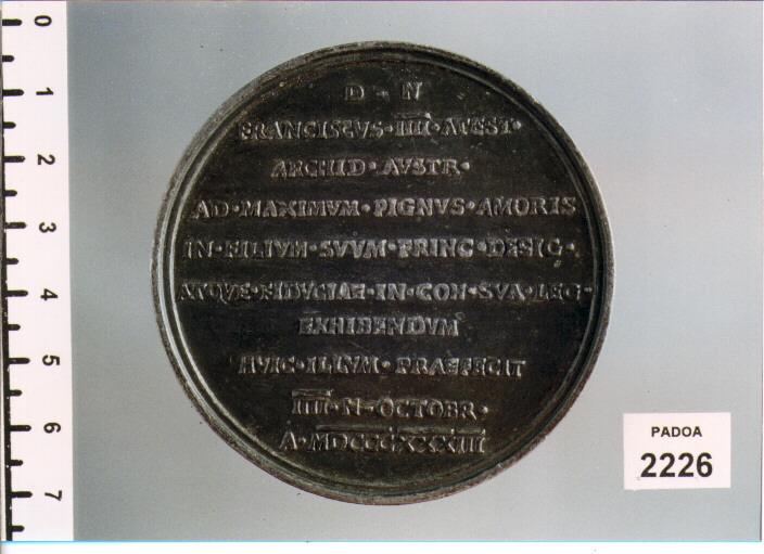 D/ FRANCISCVS. ATEST. ARCHID. AVSTR. PRINC. MVT. DESIG. ANNOR. XV. PRAEF.COH. LEG. ATEST, BUSTO A D. ; NEL TAGLIO, G. G. F. ; R/ D. N/ FRANCISCVS.IIII. ATEST. / ARCHID. AVSTR. / AD. MAXIMVM. PIGNVS. AMORIS/ .../ IIII. N. OCTOBR. / A. MDCCCXXXIII