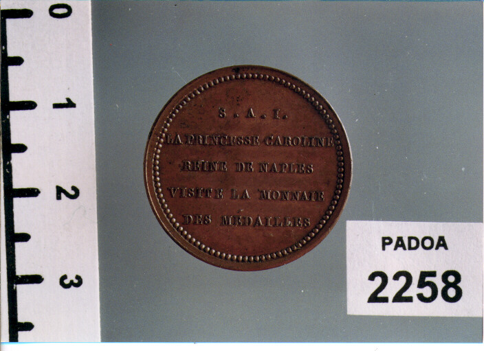 D/ BASILISSA CAROLINE (LETTERE GRECHE), TESTA A D. ; SOTTO, BP; R/ S. A. I. / LA PRINCESSE CAROLINE/ REINE DE NAPLES/ VISITE LA MONNAIE/ DES MEDAILLES