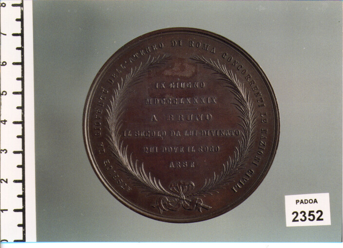 D/ MONUMENTO A GIORDANO BRUNO IN CAMPO DE' FIORI A ROMA; IN ESERGO, F. FERRARI INV. GIOV. GIANI INC. ; R/ AUSPICE LA GIOVENTU' DELL'ATENEO DI ROMA CONCORRENTI LE NAZIONI CIVILI; NEL CAMPO IX GIUGNO/ MDCCCLXXXIX/ A BRUNO/ IL SECOLO DA LUI ..