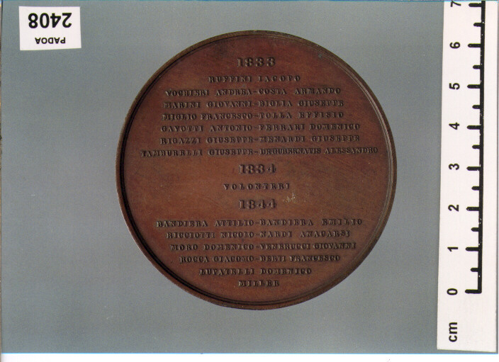 D/ ORA E SEMPRE/ LA GIOVINE ITALIA/ AI SUOI/ MARTIRI/ 1844, ENTRO CORONA DI FOGLIE; R/ 1833/ RUFFINI JACOPO/ VOCHIERI ANDREA-COSTA ARMANDO/ MARINI GIOVANNI-BIGLIA GIUSEPPE/ MIGLIO FRANCESCO- TOLLA EFFISIO/ GAVOTTI ANTONIO-FERRARI DOMENICO/ .../ ..