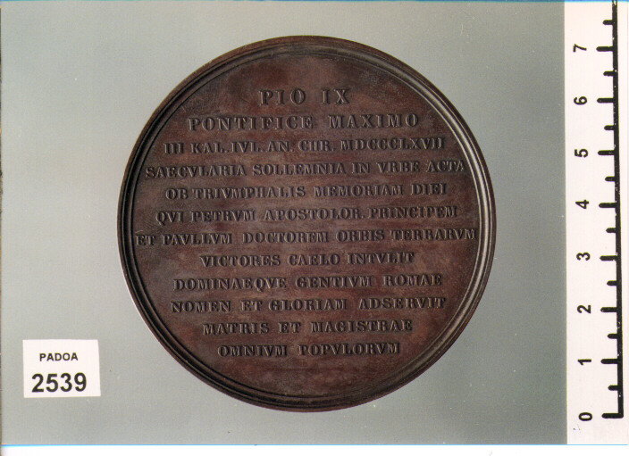 D/ PRINCEPS APOSTOLORVM DOCTOR GENTIVM, CRISTO STANTE INCORONA S. PIETRO E S. PAOLO; SOTTO, C. VOIGT; IN ESERGO, ISTI SVNT TRIVMPHATORES/ ET AMICI DEI; R/ PIO IX/PONTIFICE MAXIMO/III KAL IVL. AN. CHR. MDCCCLXVII/SAECVLARIA SOLEMNIA IN VRBE ACTA/ ..