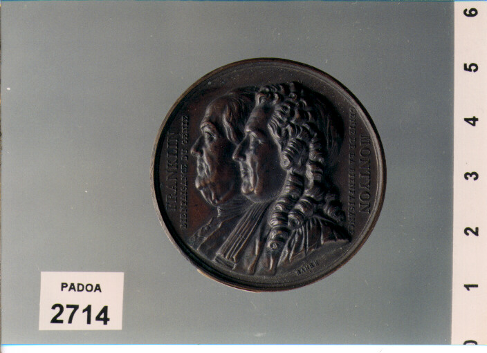 D/ DUE BUSTI ACCOLLATI A S.; NEL CAMPO A S., FRANKLIN/ BIEN FAISANCE DU GENIE; A D., MONTYON/ GENIE DE LA BIENFAISANCE; SOTTO, BARRE; R/ SOCIETE MONTYON ET FRANKLIN POUR LES PORTRAITS DES HOMMES UTILES; NEL CAMPO, LES/ SOUSCRIPTEURS/ .../ 1833,..