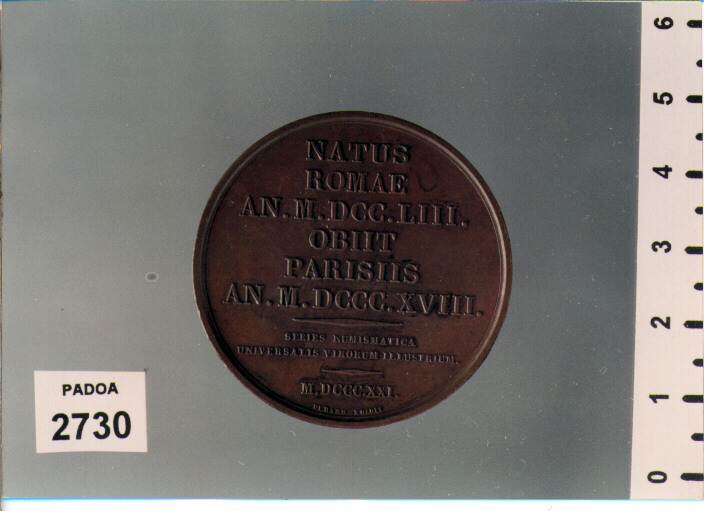 D/ QUIRINUS VISCONTI, BUSTO A S.; SOTTO, CAQUE'. F.; R/ NATUS/ ROMAE / AN. M. DCC. LIII./ OBIIT/ PARISIIS/ AN. M. DCCC. XVIII./ SERIES NUMISMATICA/UNIVERSALIS VIRORUM ILLUSTRIUM./ M. DCCC. XXI; SOTTO, DURAND EDIDIT