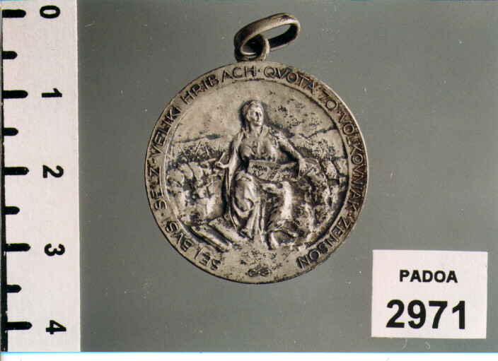 D/ 14 REGGIMENTO FANTERIA, SOLDATO NUDO STANTE CON SPADA; SOTTO, SEMPRE/ PIV' AVANTI; SEMPRE/ PIV' IN ALTO; AD IMPOSSIBILIA TENEMVR; R/ SEI BVSI. SELZ. VELIKI. HRIBACH. QVOTA 70. VOLKOVNIAK. ZENSON, FIGURA DI DONNA SEDUTAIN ATTO DI SCRIVERE