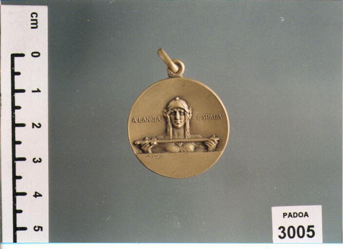 D/ UN UOMO LOTTA CON UN CENTAURO; SOTTO, XVIII.O C. D'A.A/ DELL'ARMATA/ DEL GRAPPA/ 1918; SUL BORDO, A. GIORGI SJ; R/ MEZZA FIGURA FEMMINILE ALLEGORICA REGGE UNA SPADA; NEL CAMPO A S., A LANCIA; A D., E SPADA; IN ESERGO, A. GIORGI
