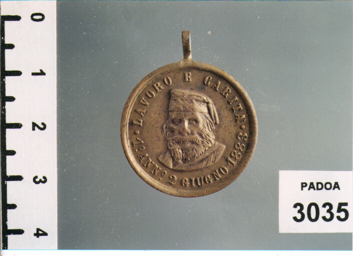 D/ LAVORO E CARITA'. 1.O ANN.O 2 GIUGNO 1883, TESTA DI PROSPETTO; R/ TRIANGOLO MASSONICO SUI CUI LATI, FONDATORI ISTITUZIONE GARIBALDI
