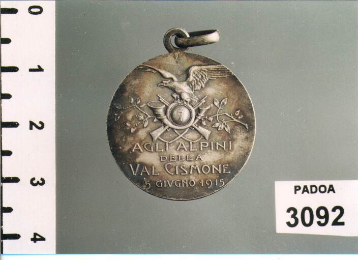 D/ PRIMIERO PER SEMPRE ITALIANA, STEMMA; R/ AQUILA SU TROMBA E FUCILI; SOTTO, AGLI ALPINI/ DELLA/ VAL CISMONE/ 5 GIVGNO 1915