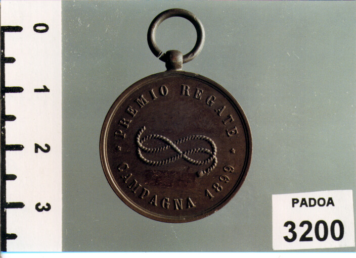 D/ ACCADEMIA NAVALE, STEMMA SORMONTATO DA CORONA FRA RAMI DI ALLORO; R/ PREMIO REGATE. CAMPAGNA 1899, NODO DA MARINAIO
