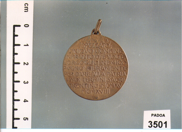 D/ 1.A ARMATA, SCENA ALLEGORICA; R/ SPEZZATO/ L'INIQVO CONFINE/ INFRANTO DVE VOLTE/ L'ORGOGLIO NEMICO/ PVGNO' FIERAMENTE/ PER DARE ALLA PATRIA/ I SVOI TERMINI SACRI/ TRENTINO. MCMXV/ MCMXVIII