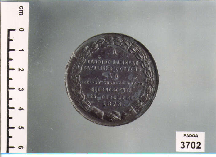 D/ SOCIETA' OPERAI GUARDIE FUOCO TORINO, DUE ASCE INCROCIATE AD UNA FIACCOLA ACCESA; R/ A/ CANDIDO RAMELLO/ CAVALIERE DOTTORE/ LA/ SOCIETA' GUARDIEFUOCO/ RICONOSCENTE/ 25 DICEMBRE/ 1873, ENTRO CORONA D'ALLORO