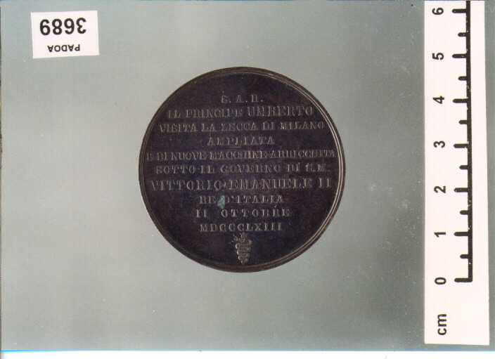 D/ S. A. R. UMBERTO PRINCIPE DI PIEMONTE, STEMMA REALE; R/ S. A. R./ IL PRINCIPE UMBERTO/ VISITA LA ZECCA DI MILANO/ AMPLIATA/ E DI NUOVA MACCHINE ARRICCHITA/ SOTTO IL GOVERNO DI S. M./ VITTORIO EMANUELE II/ ..